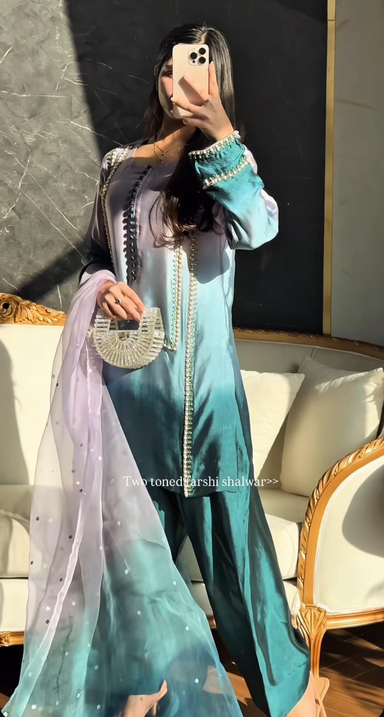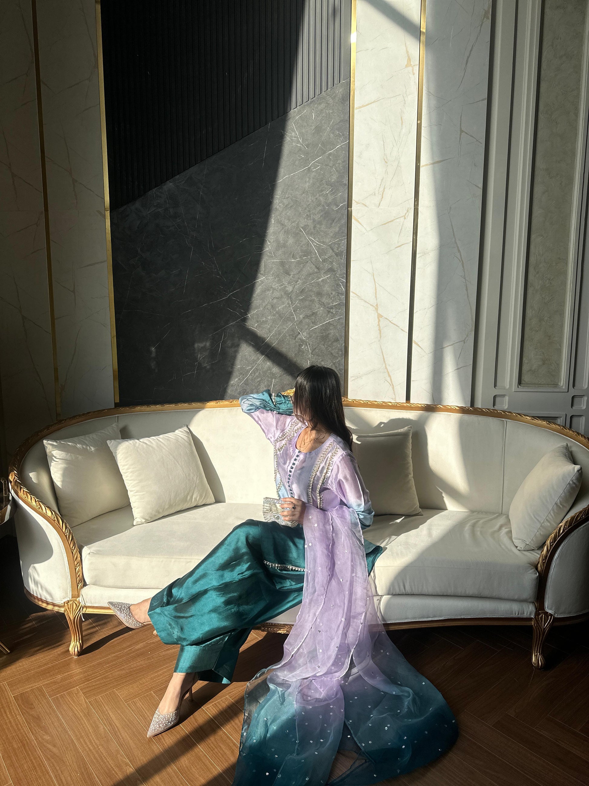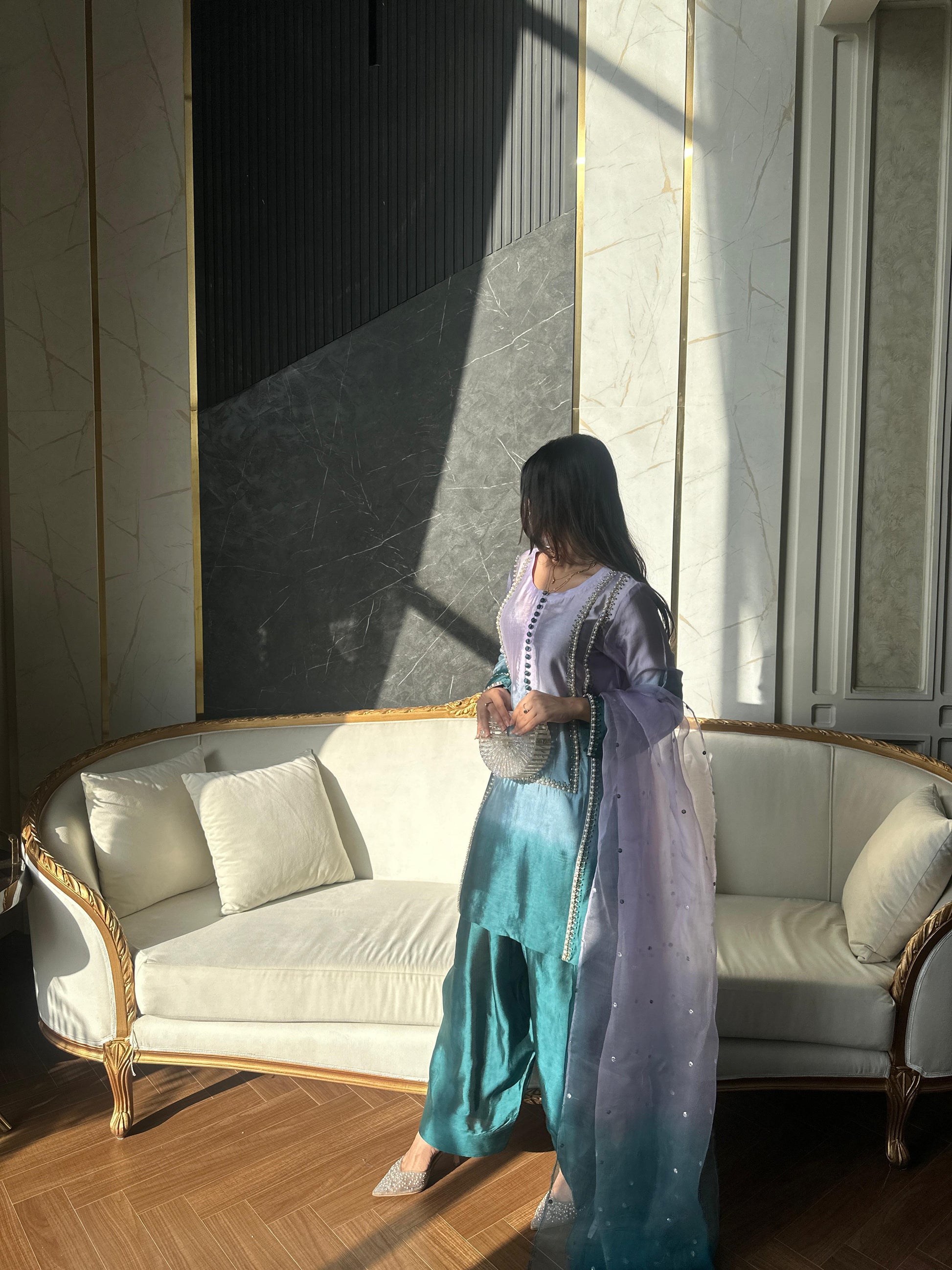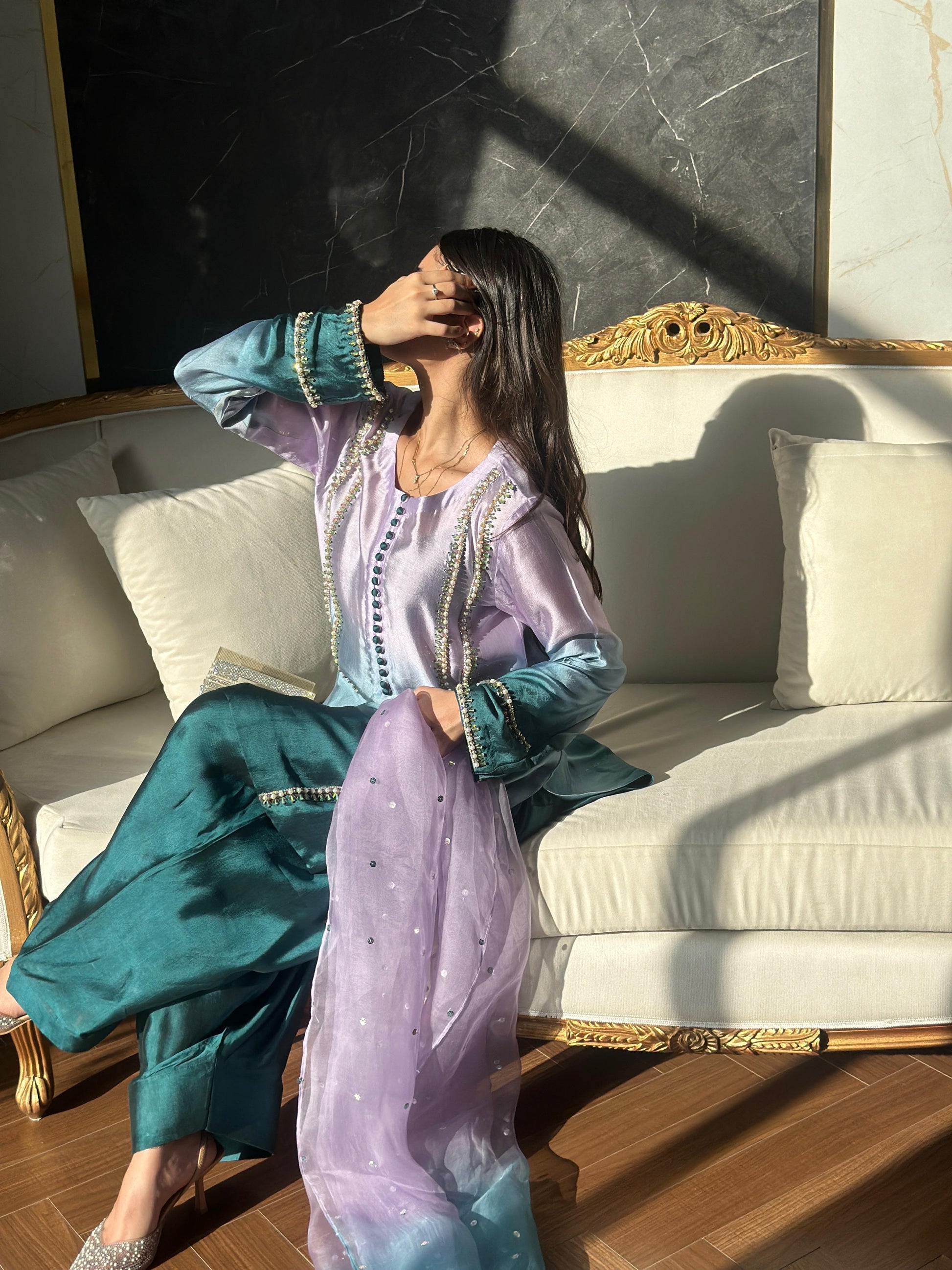 Beryl Pearl Set - pure tuscle raw silk suit toned in beryl green and lavender hues embellished with pearls crystals and stones paired with sequins adorned dupatta and shalwar