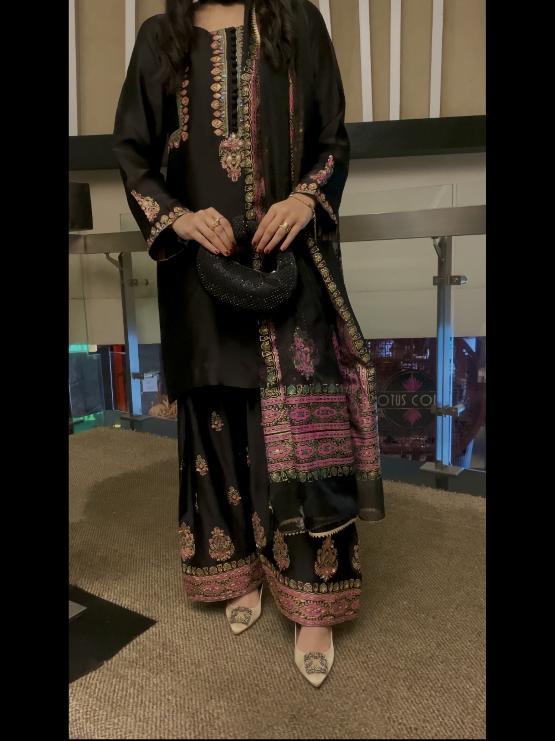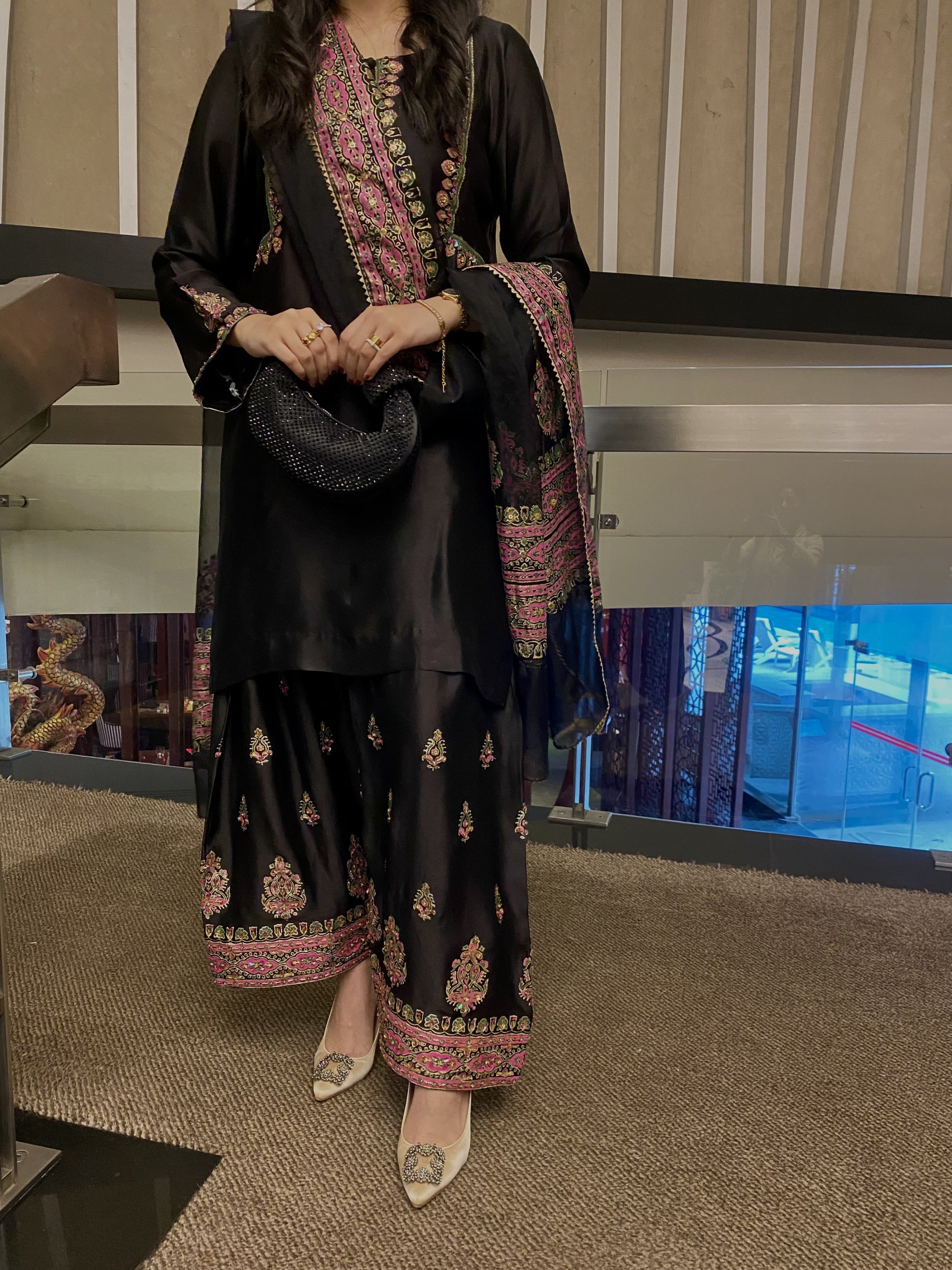 Black Pearl - The striking black farshi shalwar set made on pure tuscle rawsilk adorned with intricate handwork and vibrant traditional accent makes it perfect festive ensemble